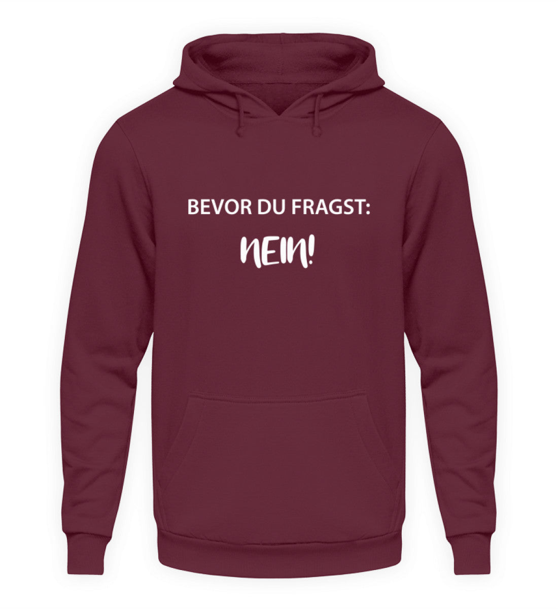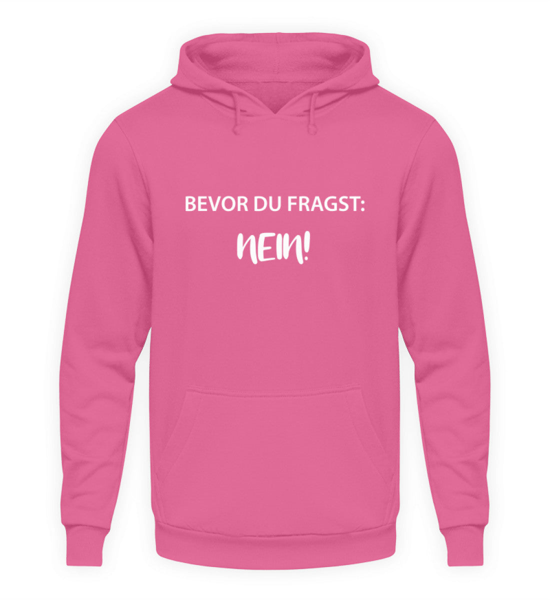 Sag’s laut und deutlich – aber mit Stil! Hol dir jetzt den Hoodie "Bevor du fragst – NEIN!" und bring humorvolle Klarheit in deinen Alltag. Ein Must-have für alle, die gerne klare Ansagen machen und dabei maximal entspannt bleiben! 😎🔥