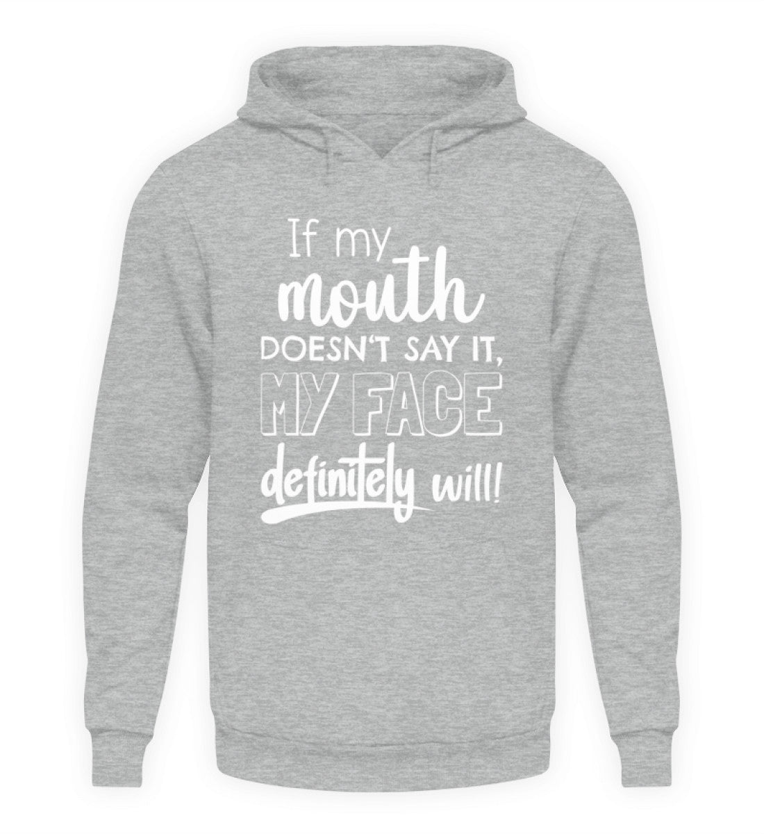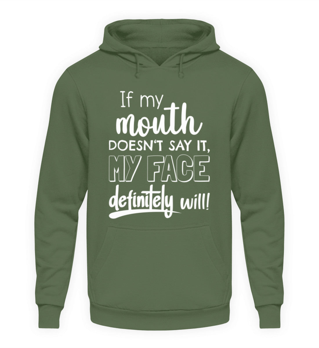 Der Spruch "If My Mouth Doesn't Say It, My Face Definitely Will" wird durch einen hochwertigen Digital Direkt Druck gestochen scharf und farbintensiv aufgebracht. Der Druck bleibt auch nach zahlreichen Wäschen brillant.