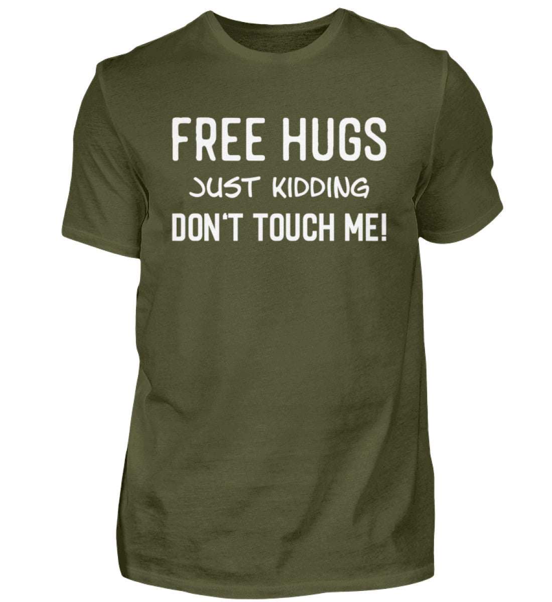 Setze ein humorvolles Statement mit Stil und Komfort. Bestelle jetzt das Herren-Shirt "FREE HUGS - Just kidding - Don't touch me" und bringe mit einem Augenzwinkern Klarheit in jeden Raum – lässig, bequem und witzig! 😎✨